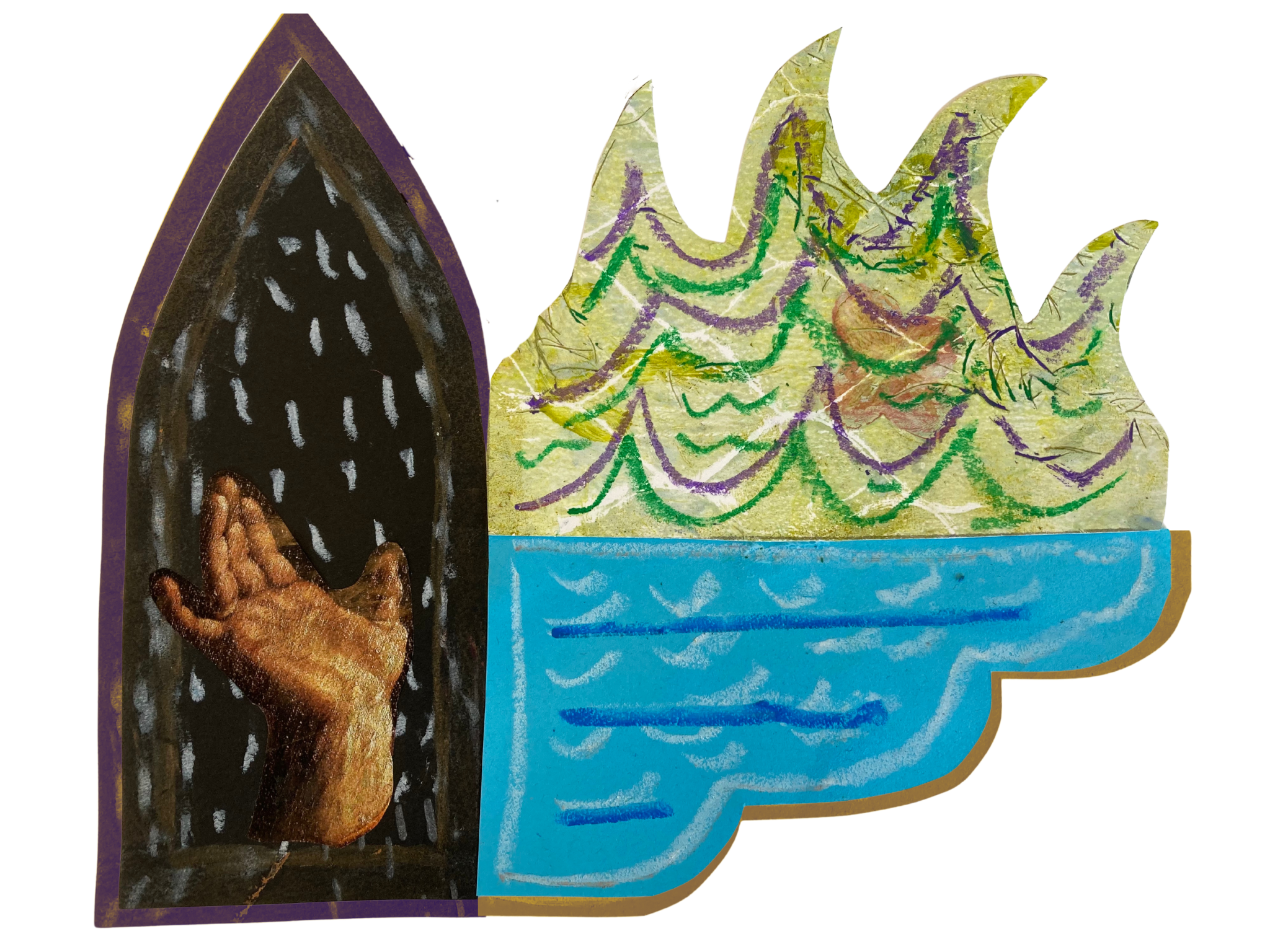 In You Were Always the Ocean, exhibiting artist Sachiko Akiyama sculpts a dreamlike world for a figure to journey between clouds, waves, trees, and mountains accompanied by boats, birds and helping hands. Using these shapes, collage, and drawing, build your own paper dreamworld to explore.