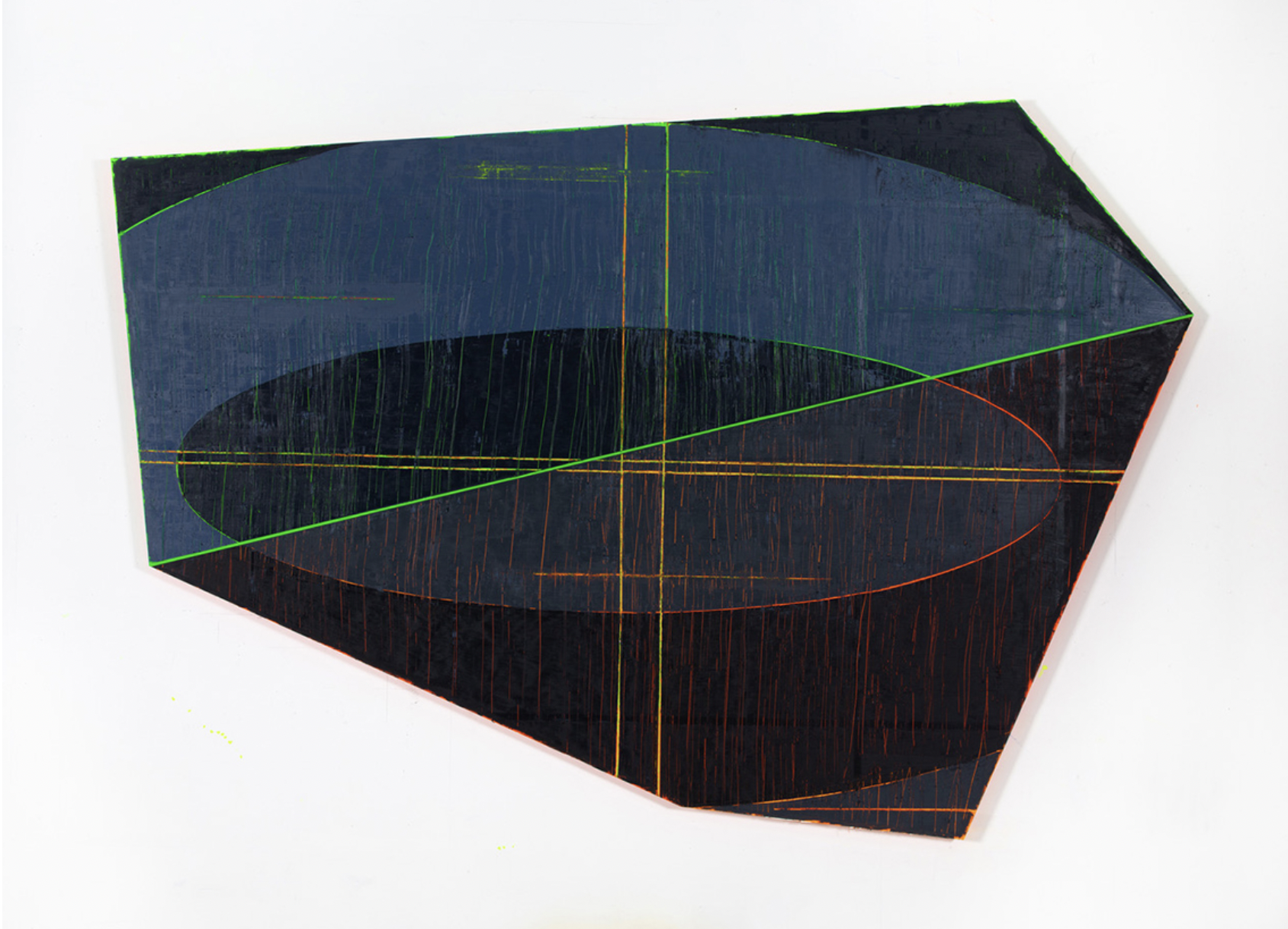 Known for his use of irregularly shaped canvases and rich colors, Row manipulates symbols of infinity and juncture—ellipses and x’s—to create spatially complex compositions that transform the illusory two-dimensional painted plane into multi-perspectival infinite space. Citing the unabashed physicality of Row’s work, art critic Stephen Maine has described it as “calisthenic abstraction.”