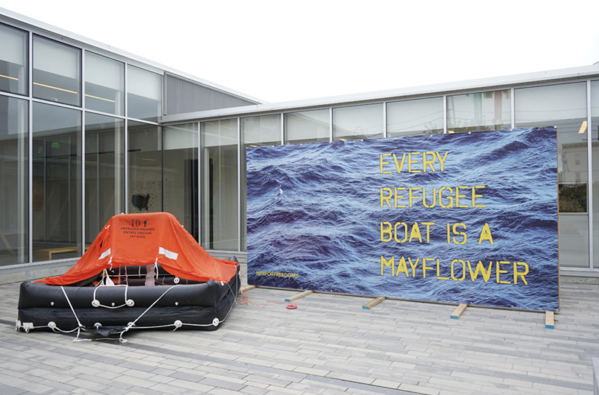 Entitled “Every Refugee Boat is a Mayflower,” Myers’s installation speaks to the growing international refugee crisis and current issues on migration. Based in New York City, Myers is an award-winning writer and illustrator of young-adult literature, whose artistic practice is equally rooted in his storytelling and interest in global affairs.