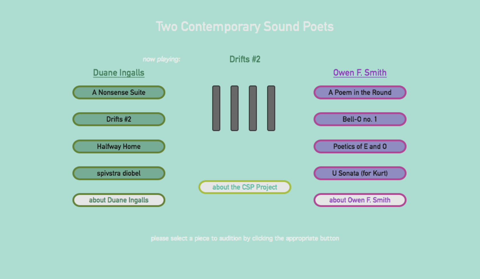 2 contemporary sound poets, a new work by sound artists Duane Ingalls and Owen Smith, is part of the Contemporary Sound Poets Recording Project. It is the first release of the Surround Project, a collaboration between the Experimental Practices Research Group, housed at the University of Maine in Orono, and Pogus Productions, based in New York. This work is a sampling from the audio-expansion of several poems written this past winter and spring. It incorporates voice and several accompanying instruments and effects.
