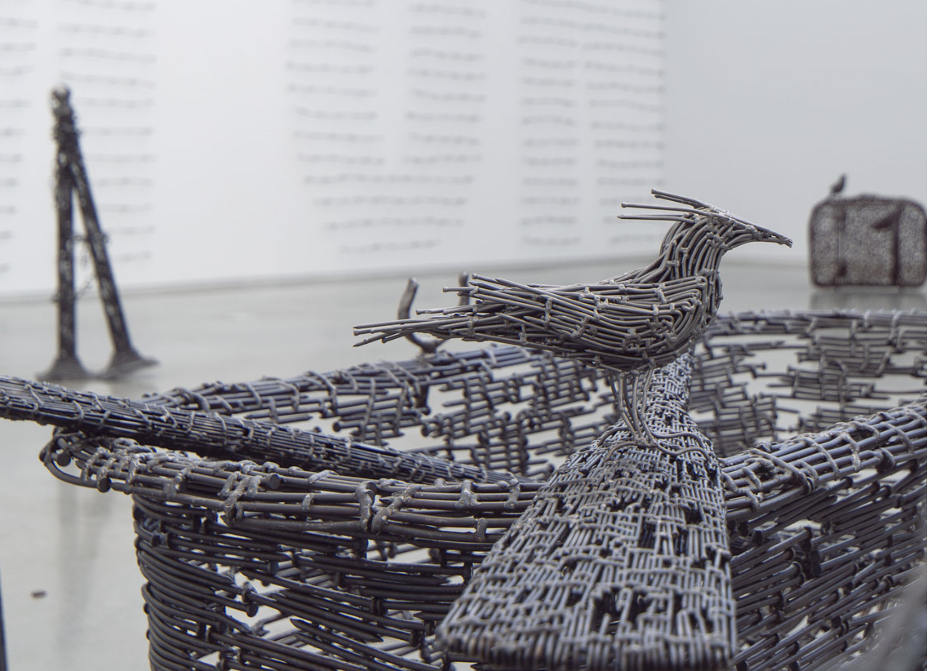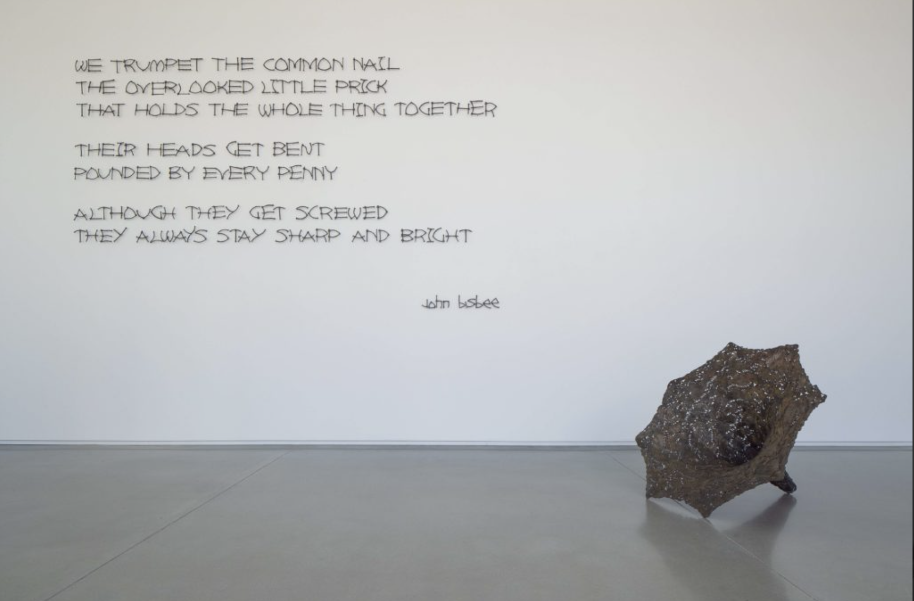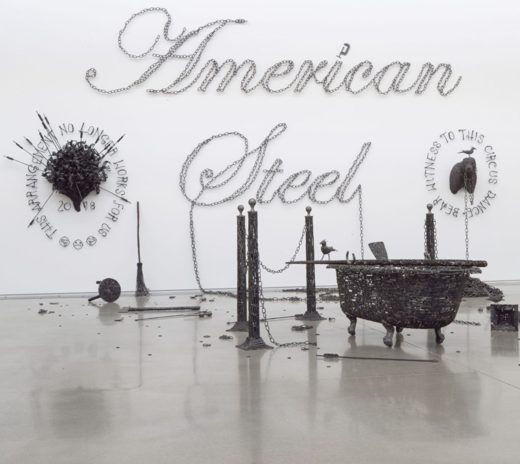 Constructed entirely from nails, by hand, Bisbee’s objects draw on a deep well of American historical and vernacular imagery. They are made in a spirit of solidarity with workers of all kinds; each nail expresses the idea of things joined together. Yet the exhibition also has a critical edge. Bisbee uses poetic language, narrative imagery, and potent emblems to express his concern with our country’s direction. American Steel is thus a statement on current affairs: in his own words, an “abstraction of who we are, right now.”