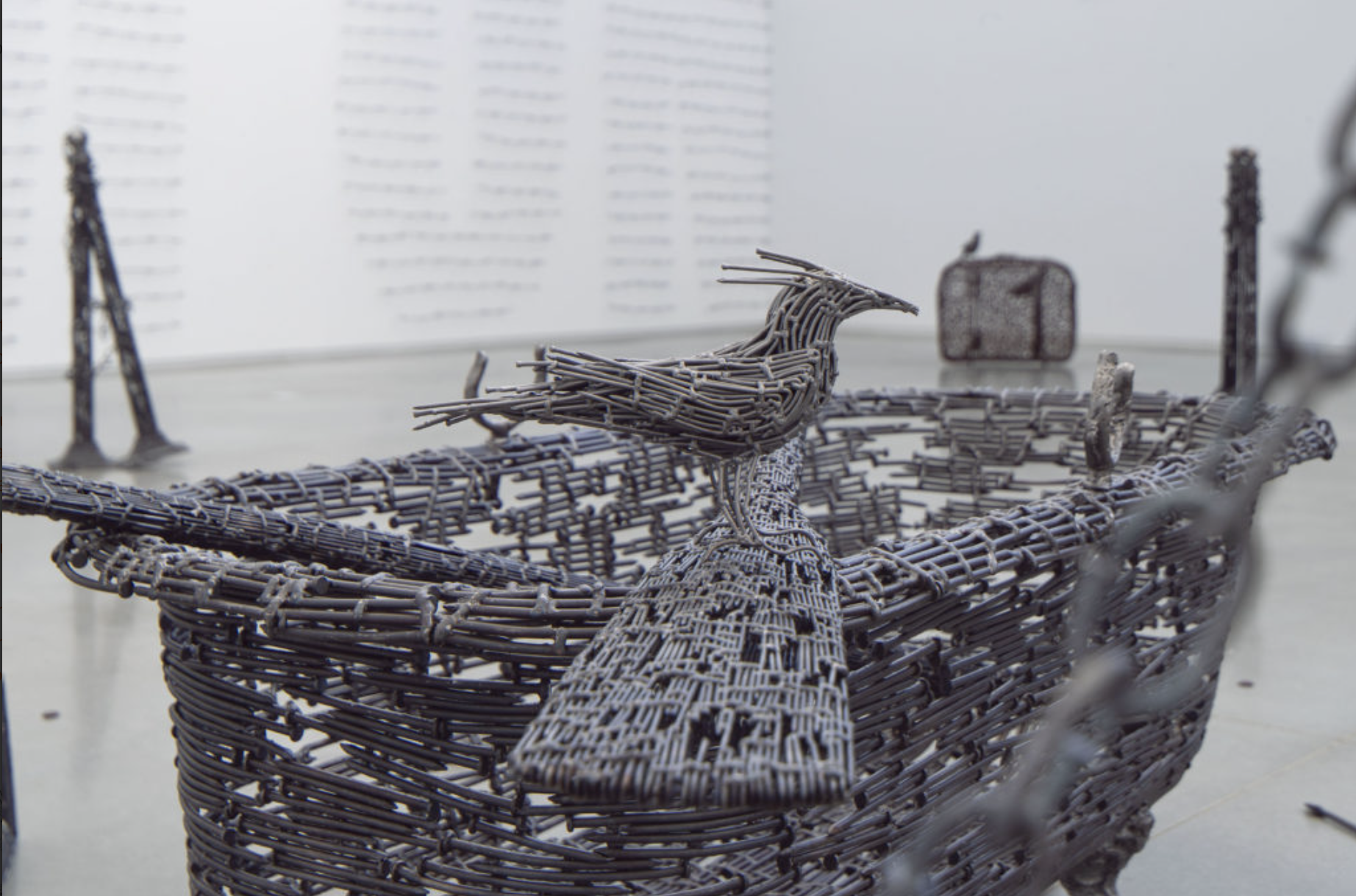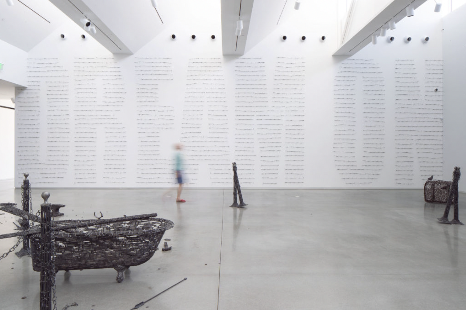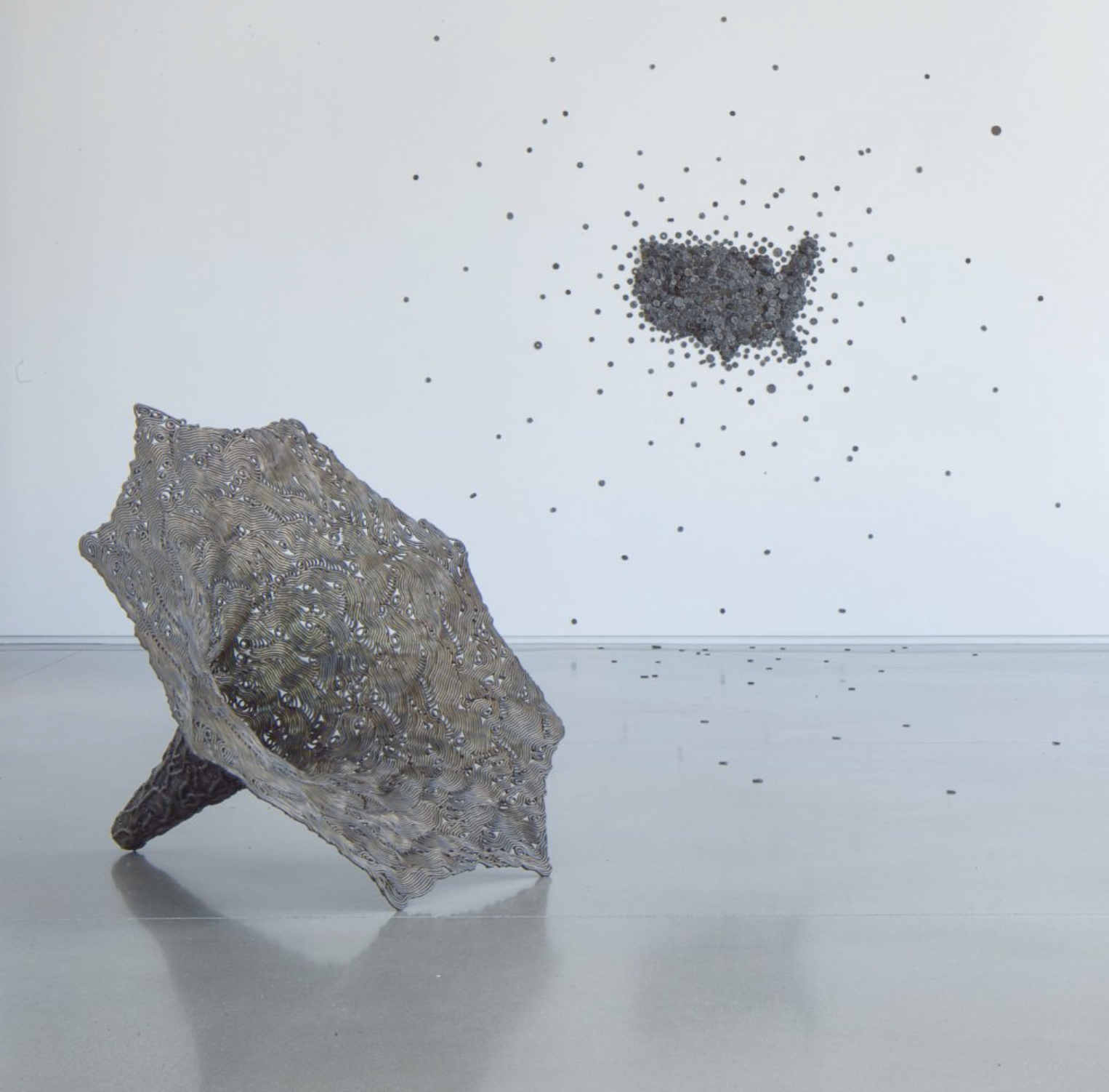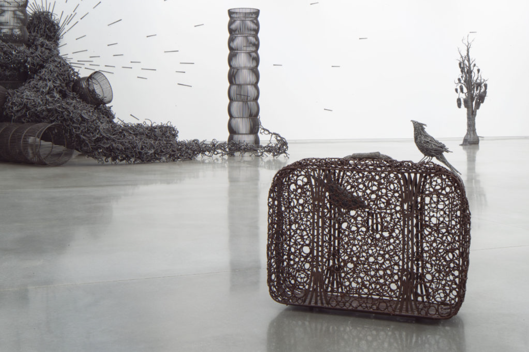 Constructed entirely from nails, by hand, Bisbee’s objects draw on a deep well of American historical and vernacular imagery. They are made in a spirit of solidarity with workers of all kinds; each nail expresses the idea of things joined together. Yet the exhibition also has a critical edge. Bisbee uses poetic language, narrative imagery, and potent emblems to express his concern with our country’s direction. American Steel is thus a statement on current affairs: in his own words, an “abstraction of who we are, right now.”