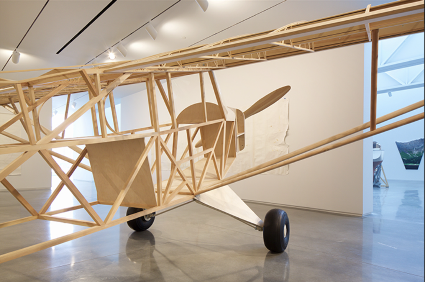 The most noticeable thing about artist Mark Wethli’s Piper Cub is that it’s incomplete; the abstract framework of an airplane rather than one that’s ready to fly. Piper Cub’s identity is further complicated, like Magritte’s famous pipe, by its uncertainty. Is it an actual plane, a sculpture of a plane, a full-scale model of a plane or in some sense (in its idealized, Platonic forms) the prototype of a plane? Although it’s not an actual aircraft (one that can be flown) it’s built from the original plans, identical to a real Piper Cub in every detail and dimension including the use of actual Piper Cub parts for the windshield, landing gear, and tires.