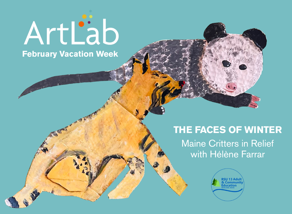 Bears, Raccoons, Crows and friends will be our source of inspiration as we study and sketch the geometry, form, and textures of Maine's winter critters. These sketches will serve as plans for creating dynamic, multi-level relief cutouts out of cardboard and other recycled materials that will be painted as the week develops. Participants will also develop a toolbox for creating texture and marks in paint.