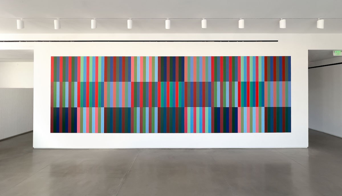 By setting carefully selected colors alongside one another in a systematic, syncopated fashion, Sears creates works that are more than the sum of their parts. Sears knows, for example, that we often process red and blue stripes in close proximity into a field of purple, or that a neutral gray may read warm or cool depending on an adjacent color, and experiments with these effects. If Sears’s colors and forms act as two overlaid compositions existing with some independence—which we might consider as first and second visual fields—then sustained attention generates a third optical field as a result of their interaction. The third field is not merely optical but also meditative and emotional, suggesting things felt rather than seen. To paraphrase Martin, the third field is where the inner eye contemplates all that we have seen, and emotions rise to the surface.