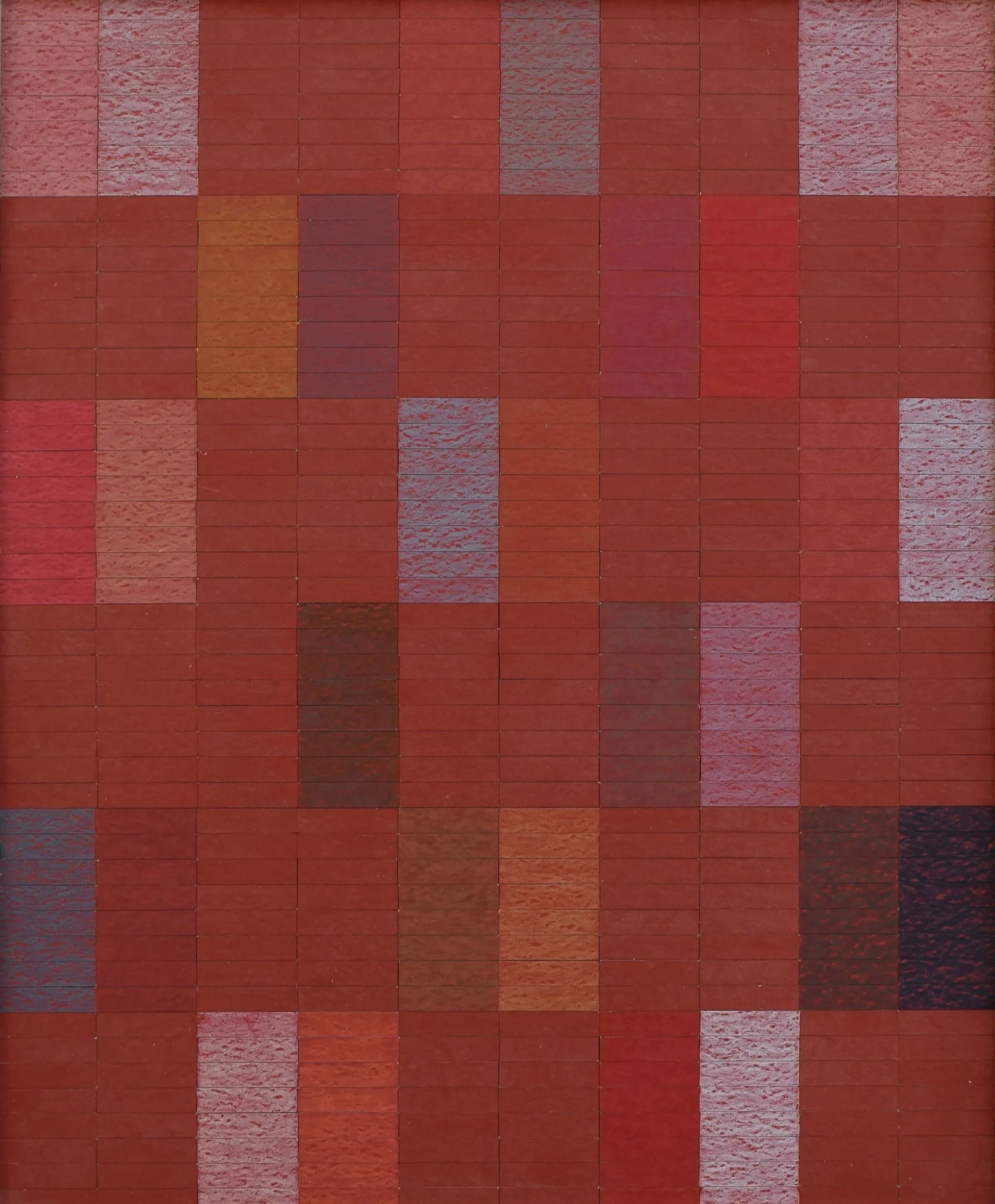 In the simplest terms, Sears’s assemblages are made from wooden blocks. He paints sheets of plywood in a single shade of latex paint and cuts them into small, regular shapes. In many works, Sears rubs colored pencil over the bumpy surface of the underpainting, then assembles the blocks together in a mosaic-like fashion, creating an optical “push-pull” akin to that found in the Op art paintings of Bridget Riley. He arranges the blocks flush against one another, letting their seams register as both edges and gridded lines, and sets them in handmade frames that both reinforce their presence and contain what could become an otherwise endless visual field. “The Third Field” includes recent assemblages and an original, site-specific mural—the first time Sears has shown these two aspects of his practice side by side.